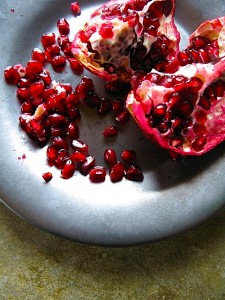 To make this delicious and festive cocktail, begin by selecting a dark red pomegranate, (Punica granatum)Â from the market, (deep red, leathery skin is an indicator of ripeness). Tear open the leathery skin and remove the juicy red seeds from the pith. Opening the pomegranate may require a bit of effort. This is a fun-messy job, so get near a sink and towels – it helps to begin with a sharp knife. Once you get through the tough skin, simply rip the shell open.