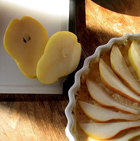 Last week I mentioned my fondness for Marion Cunningham’s delightful Breakfast Book. Marion’s collection of recipes includes many delicious coffee and breakfast cakes. Also last week, while visiting one of my favorite cooking blogs, Clotilde Dusoulier’s Chocolate and Zucchini, I found a slightly different twist on a much loved, basic coffee cake from Marion’s book. Gateau au Yaourt is a simple and easily modified French cake recipe. Clotilde posted a variation on this yogurt cake with apples and maple sugar, (in honor of her nephew’s first birthday – we are both new aunts, and I was excited to read that she takes this as seriously as I do!). I tried this cake and I absolutely loved it. So, this morning I decided to combine Clotilde and Marion’s recipes together, adding fresh Bartlett pears atop the cake, and the result is quite delightful, (I am enjoying a slice with coffee as I write to share this with you). I think the subtle, exquisite flavor of Bartlett pears works perfectly with this recipe – it’s a simple, easy-to-make treat for this wintery, holiday season.