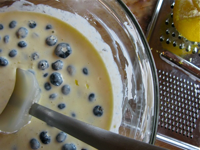 To make batter: Toss flour, baking powder, baking soda and salt in a small bowl. In a larger bowl, combine eggs, sugar, sour cream, melted butter and lemon zest and beat until well mixed. Add dry ingredients to wet and mix until just blended. Add blueberries and stir lightly to combine.