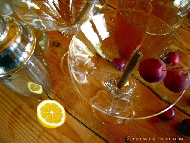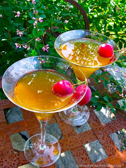 Zeke Goodband’s apple cider is the best I have ever tasted, and it makes the most delicious base for an autumnal twist on the traditional apple-martini. The golden color of this cocktail is beautifully enhanced by the addition of a pretty, ruby-red, heirloom Dolgo crabapple garnish. Of course, if Dolgo crabapples are nowhere to be found, any tiny red apple —or slice dipped in lemon juice— will do. But, if you prefer a non-alcholic drink, travel back to my post on hot mulled apple cider, another delicious way to enjoy this fruit of the season!