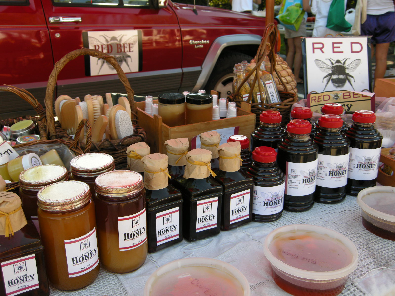 A market table filled with Marina’s artisan honey and Red Bee products…