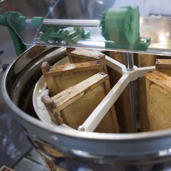 Harvesting honey from uncapped frames in the spinner – and below the end result of this collaborative effort between Marina and her bees…