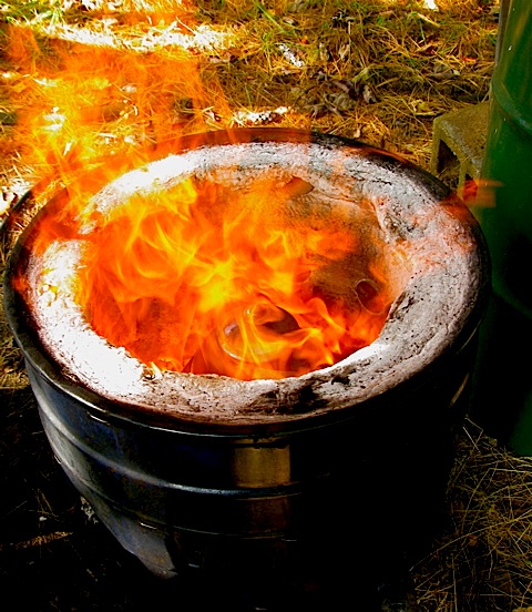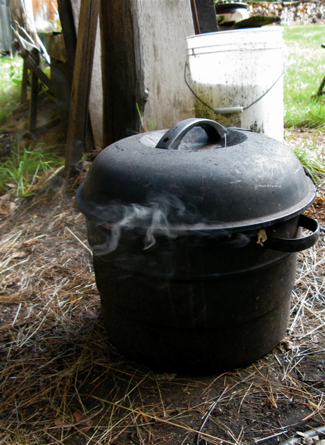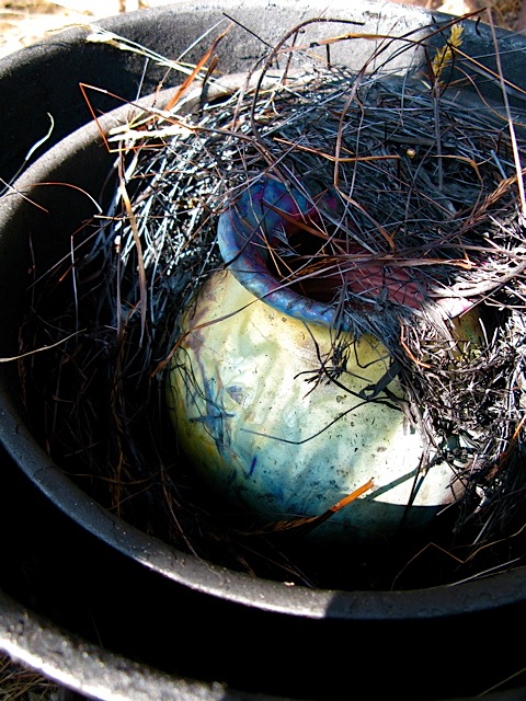 The cooling vessel, (note the grass still attached where it has burned in lines)