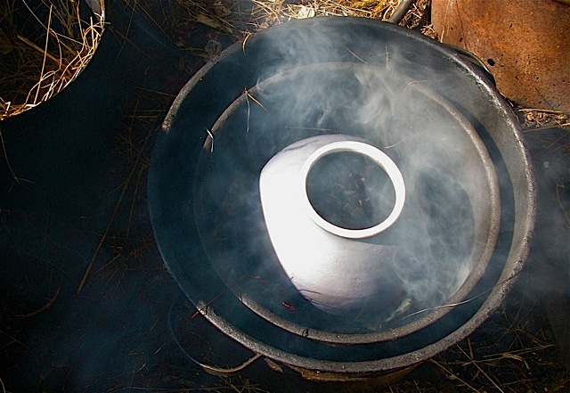 From here, Richard’s process becomes positively fascinating to anyone inspired by nature and her beautiful botanical world. While still red hot, Richard places his vessels within a nest of hand harvested straw and wild grasses from his field – he also tosses pine cones into this smoking, combustible mix. When a lid is placed atop his make-shift ‘double boiler’, the resulting heat, smoke and flame put on quite a show. Meanwhile, inside the vibrating pot, the straw fuses with the glaze to form exquisite, unpredictable patterns on Richard’s shapely vessels.
