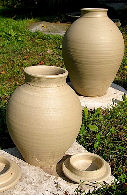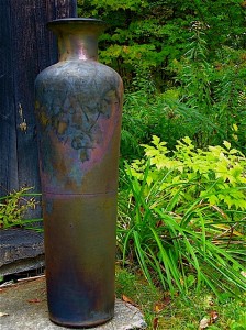 Richard uses the raku method to create a wide range of extraordinary pieces – from large metallic-glazed urns, (works of art suitable for the indoor display of flowers, branches and grass), to statuesque crackle-glazed vessels, ( I envision them beckoning at the end of a garden path or shady corner), to smaller pieces, including beautiful table-sized vases and ewers. Richard also continues to work with stoneware, creating garden-art such as the all-season lantern pictured below…