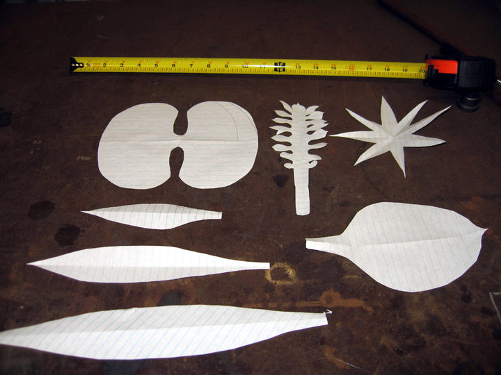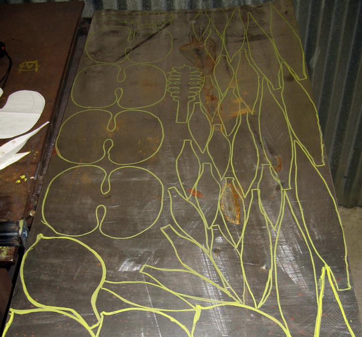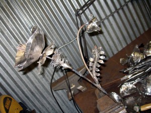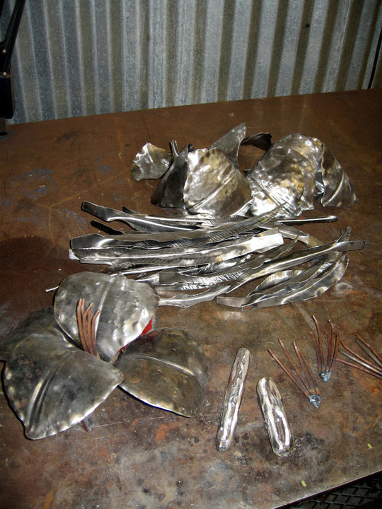 Inside Shawn’s shop: amazing, giant metal flowers —stored outside to achieve a fine rust patina— ready to receive a finish coat to halt, or at least slow down, the process of oxidation.