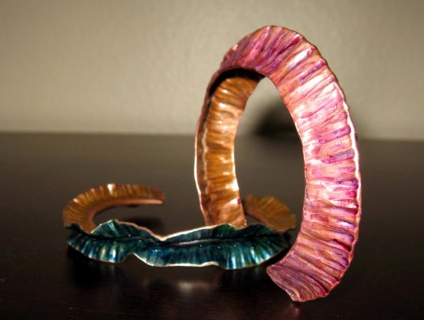 Interested in seeing more of Shawn’s work, or learning a bit about her process? I highly recommend visiting the Soleil MetalArts page on Facebook. The artist operates her page like a blog, and regularly updates by posting her work in progress, news and other studio information. Here you will find beautiful examples of her metal sculpture and functional art objects, such as the metal planter boxes pictured below. Her work ranges in price; dictated mainly by size, material, and creative process. Prices for her jewelry begin around $100 for small copper cuffs (she also works in sterling silver, which has a slightly higher starting price-point); traffic light birdbaths start at $125; and larger pieces such the ribbons birdbath at top begin at around $1,200 – $1,500. Soleil MetalArts accepts all kinds of creative commissions, but does not do production work. Shawn McCurdy is an artist, and everything the she creates is one-of-a-kind…