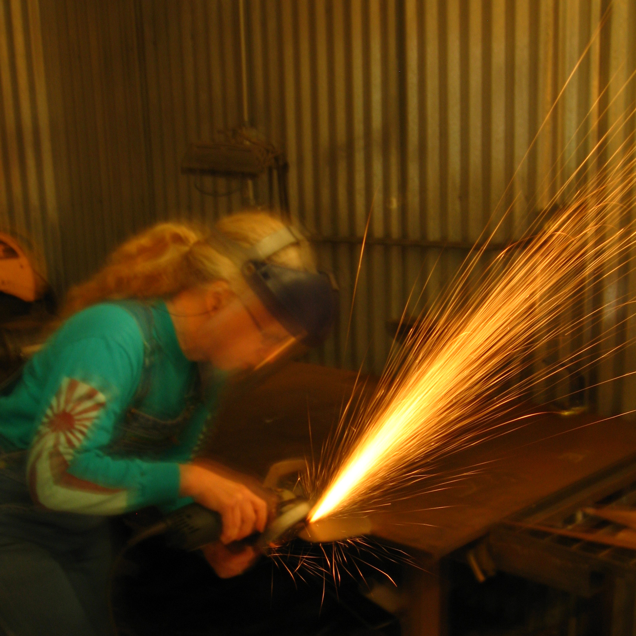 As the gardening season begins to wind down, ‘Art Inspired by Nature’ —an ongoing, seasonal series here on the blog— will be returning. And like many of you —some who have written asking about what happened to the regular artist-features— I’ve missed them! One of the things I truly love about writing this online journal is the fascinating, creative people I meet and places I visit. I discovered Shawn McCurdy’s work on The Gardener’s Eden’s Facebook page, when the artist’s profile picture (see below) caught my attention in one of the comments. I’ve always been fascinated by three dimensional metalwork, and although I’ve yet to try it myself, welding seems particularly intriguing. Drawn in by her flying sparks, I clicked over to her profile page and found a link to her studio website, Soleil MetalArts. When I saw her work —particularly the garden sculpture and birdbaths made from recycled materials— I knew I just had to share her her art with all of you…