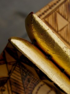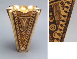 Michelle Holzapfel, Four-Panel Tattoo Vessel, 2007, Basswood, Pyrography, Gilding, and Waxed Linen Thread
