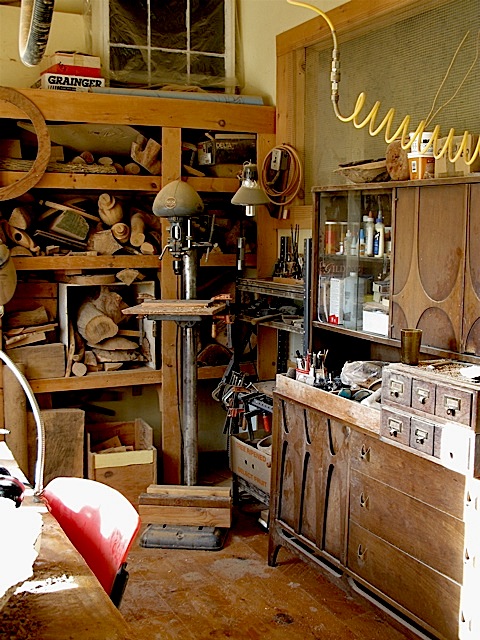 Michelle’s chain saw and lathe, photo, © David Holzapfel, courtesy Applewoods Studio