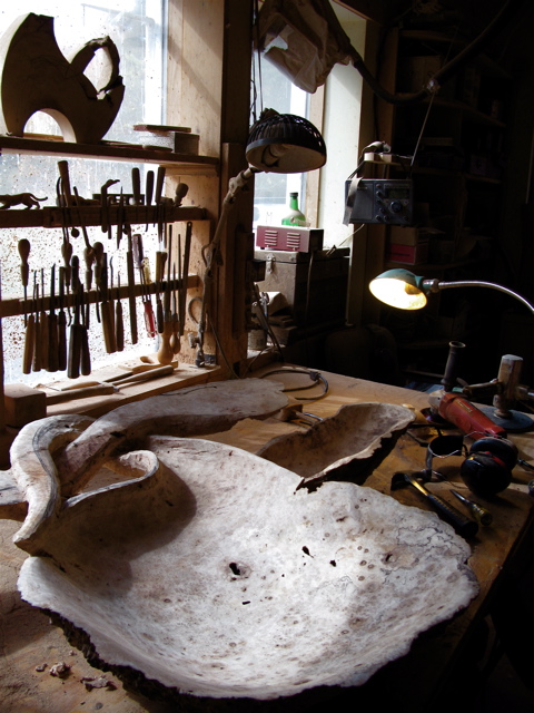 From this point on, Michelle’s work may proceed in many directions, as vision and inspiration guide her. Her themes vary from the modern domestic to the roots of western civilization and Greek myth. Some of her pieces require the use of power tools including saws, grinders and/or traditional hand-carving tools, (see photos of her studio table below). Some works marry hardwood vessels with soft, intricately carved basswood components to form complex, richly textured sculpture. Other pieces incorporate sewing, pyrography, (‘tattooing’ or burning of the wood), bleaching, polishing, staining and/or painting, oiling, and even the inclusion of objects, such as the padlock worked into ‘Lockhart’, featured in the third photo below…