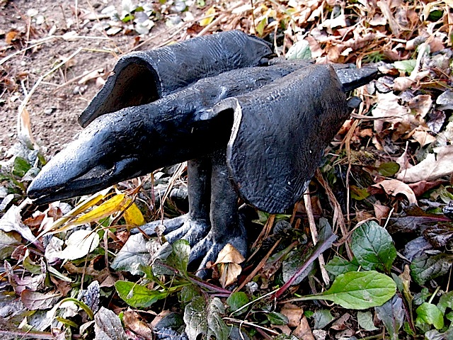 Although Virginia’s work is all quite beautiful to my eye, there is one sculpture series that truly stands apart. While discussing her ‘Crow’ series, Virginia told me about a dream she had some time ago. While she was sleeping, two crows appeared. The birds were tormented and distressed; caught up in plastic, croaking, ‘Evermore‘, (as opposed to ‘Nevermore’, a line made famous by Edgar Allan Poe). In response to the dream, Virginia began creating the ‘Crow’ series pictured below. This work is quite different from her other series’. The crows are hand built from weather proof stoneware. They are wonderfully animated, with expressive features and etched detail. Because I am quite fond of Edgar Allan Poe’s poem, “The Raven”, I was immediately taken with both the story and the work. Then, when I saw the amazing birds grouped in Virginia’s autumn garden, I was completely bewitched. The artist has captured the spirit of a cackling flock of crows, exactly…