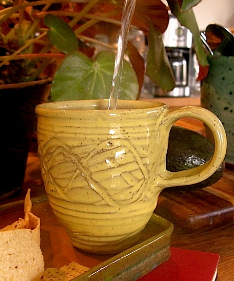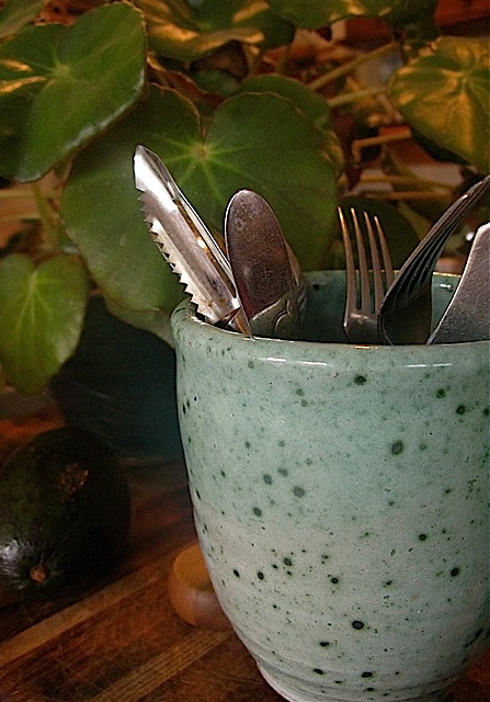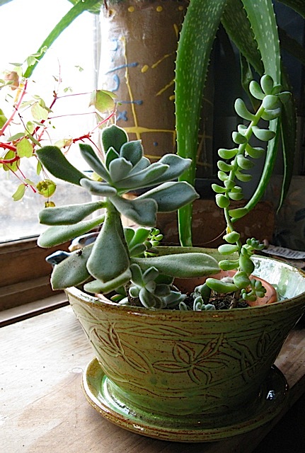 After touring Virginia’s studio and greenhouse, we sat down in her kitchen for a spell. The artist’s home is warm and welcoming – dozens and dozens of her colorful, beautiful stoneware mugs, plates, bowls and cookware line the shelves of her sunny kitchen. Plants from The Old School House Plantery and nearby Walker Farm fill the room with life and fragrance; her lovingly tended collection all nestled within beautiful handmade flowerpots…
