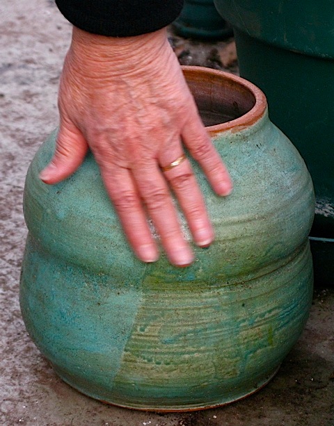 Virginia’s alpine strawberry planters and a gorgeous sea green urn, shown below as the artist rubs the smooth surface with her hand…