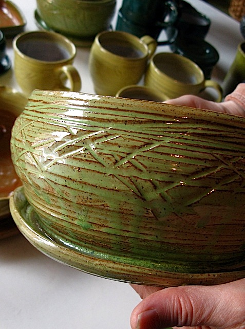 Virginia Wyoming holds one of her beautiful stoneware flowerpots, etched with grass-like markings and finished with a multilayered earth-green glaze…