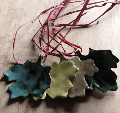 Virginia’s delicate leaf ornaments in subtle green and grey hues, and below, some of her newer experiments with botanical imagery…