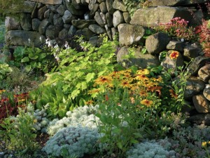 Combining late season perennials with neutral-hued foliage plants such as Artemisia schmidtiana ‘Silver mound’ helps keep the August garden from becoming too riotous and loud. Spring and early summer blooming favorites, such as coral bells, (Heuchera), and lady’s mantle, (Alchemilla mollis), continue to play an important role in the garden by adding color and texture, holding a perennial bed together at the edge. Gardens designed to include foliage plants such as these rarely look tired, even during lulls in the bloom season.