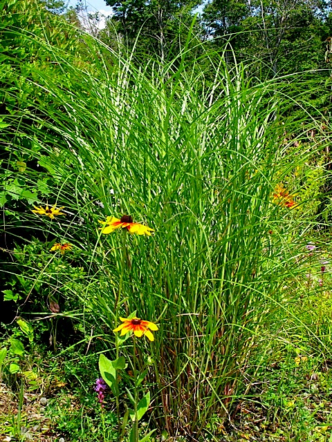 Although they have become more popular of late, ornamental grasses are still largely underutilized in perennial borders. Miscanthus sinensis ‘Variegatus’ and ‘Morning Light’ are two of my all-time favorites, and the splotchy green and yellow stripes of Miscanthus ‘Zebrinus’ make a bold statement when paired with primary-colored coneflowers and violet phlox. The contrasting hues and narrow blades of variegated ornamental grass catch the light and play off many perennials and nearby shrubs. All tall grass has a lovely way of swaying in the breeze, but none quite so poetically as buff-tasseled Calamagrostis x acutiflora ‘Karl Foerster’. Last year I positioned Karl along the edge of my wildflower walk, where he adds movement and a delicate shimmer to a solid grouping of Viburnum. Further along the path, fountain shaped Miscanthus sinensis ‘Morning Light’ adds sculptural elegance where the casual meets the more formal entry to my home. Foliage plants such as ornamental grass, along with structural shrubs, help to create the framework for an entire garden. As spring and summer plantings fade and make way for mid-season and early fall perennials, the statuesque form, alluring texture and seductive movement provided by ornamental grass can be key to anchoring a great perennial garden design. Tall grass can also be used as a living screen, concealing unsightly necessities such as compost bins, plastic vents and air-conditioning units throughout the growing season, and into winter.