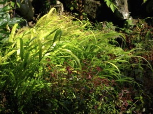 Although ornamental grasses have become quite common in sunny perennial gardens, they are still surprisingly overlooked in shade garden designs. This surprises me because grass exists naturally in all but the darkest of shady woodlands, and they can add tremendously to the subtle beauty of low-light gardens. In the shade, I often add fine textured ornamental grass to contrast with larger, broad leafed foliage, such as the leathery, smooth surfaced leaves of hosta. I also like to include bright colored grasses to shade gardens in order to illuminate dark corners and shadowy areas beneath trees. Japanese woodland grass, (Hakonechloa macra), is one of my favorite plants. The golden cultivars, ‘Aureola’ and ‘All-Gold’ are very useful in low light areas, and in contrast to violent-tinted foliage. Newer cultivars, such as ‘Nicolas’ and ‘Ben Kaze’,(mentioned above), are rich in bitter orange and burgundy hues. These are truly spectacular plants with enormous design potential. Sedges are also useful in partial shade. I count orange-hook sedge, (Ucinia egmontiana), among my favorite low-light grasses, although it is marginally hardy in New England, (I usually place it in pots for summer and move them inside for winter). Â Sedges will also tolerate more sunlight, provided they are given ample moisture, and I like to use them in brighter locations as well, (see pots on deck below).