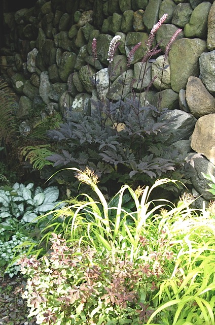 The golden color of this Japanese forest grass brings out the violet hues in the companion plantings of Cimicifuga racemosa ‘Hillside black beauty’ and the young foliage of euphorbia on the left