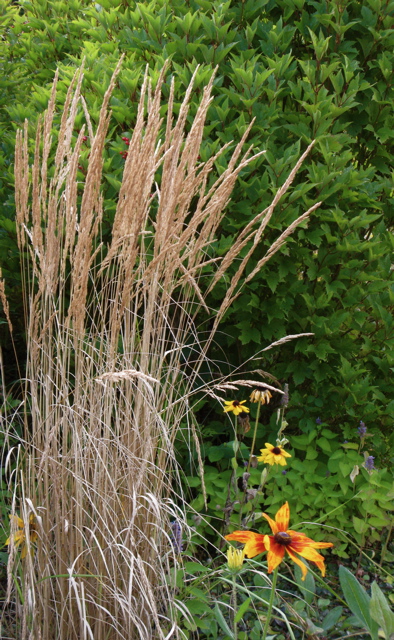 Calamagrostis x acutiflora ‘Karl Foerster’, backed by Viburnum trilobum