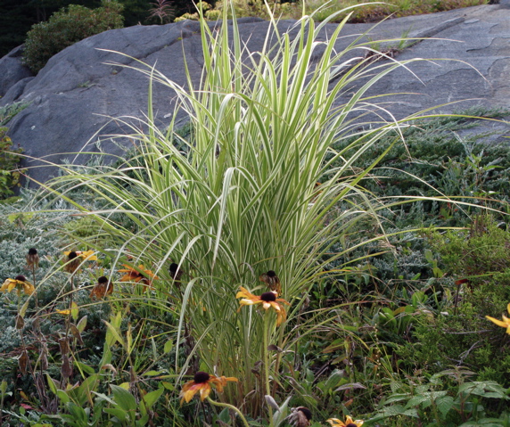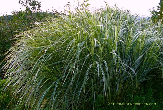 Miscanthus sinensis ‘Variegatus’, here used as a specimen and below, a different cultivar used in a large grouping at the eastern-edge of the garden.