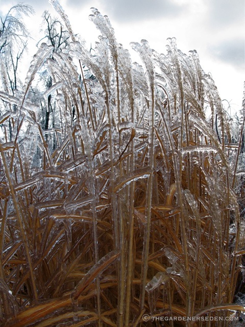 Grasses remain beautiful well into winter. Above, pictured in the entry garden at Ferncliff, fountain grass and side oats look particularly magical in December when coated with ice or snow. Below, the tassels of Miscanthus sinensis, frozen with ice, catch the January light…