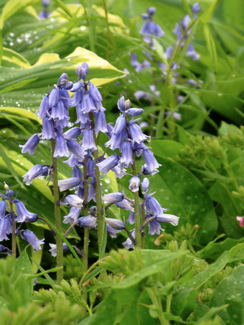 Hyacinthoides hispanica,’Excelsior’, (Spanish Bluebell), shown here with Pulmunaria saccharata, (Bethlehem sage), and emerging hosta.
