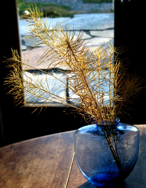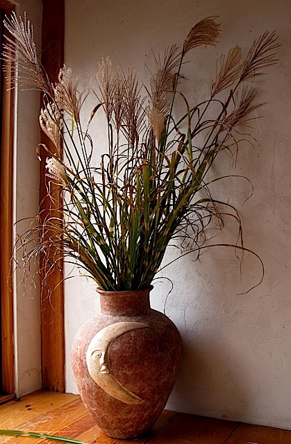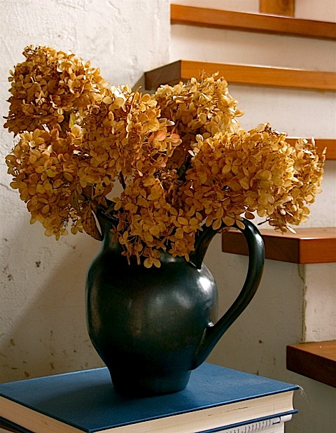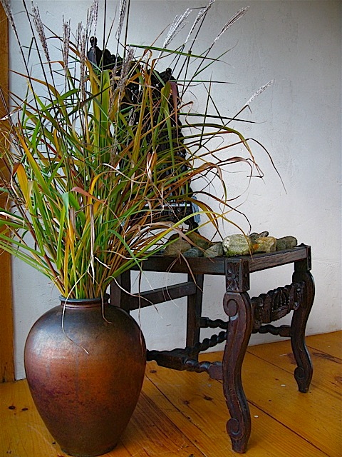 The last days of October have arrived and the natural world outside my door is slowly bleaching, bronzing and browning to a warm patina. Gorgeous distractions demand my attention at every corner. Still, there is much work to be done in the garden before winter arrives – so I wander about the flower beds daily, preparing for next season’s long slumber. As I gather up pots, toss spent annuals, and attend to various autumn gardening tasks, warm rays of sunlight illuminate ornamental grass and dried flowers, highlighting their texture and form. The stark and skeletal remains of Queen Anne’s Lace and the honey colored needles of Amsonia hubrichtii seem to call out for individual attention. As I work I often collect some of nature’s gifts for indoor display. Placed in delicate vases without water, these bits of frilly, feathery foliage will last for weeks on table and desk tops, where they sparkle in the late afternoon sun as I write. Larger souvenirs from my garden, (such as Hydrangea paniculata and Miscanthus sinensis), fill Aletha Soule’s vases, Richard Foye’s vessels and various old, terracotta urns placed near brightly lit windows and doors where they catch the long, golden light.