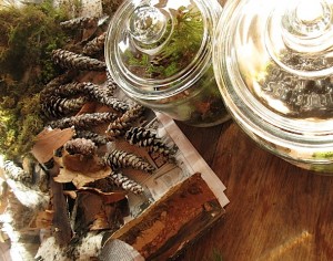 Creating a basic terrarium is very simple, and it’s a fun project for kids and adults alike. All you need to begin is a glass jar with a lid, a bag of pea gravel, sphagnum moss, potting soil, a spray-bottle filled with water, and a selection of rocks, bark, sticks and plants. Holiday conservatories, filled with birch bark, native moss, ferns and partridge berry look particularly lovely centered on a dining table or grouped together on a mantel. Terrarium design is limited only by your own imagination! For inspiration, I love Tovah Martin’s book, The New Terrarium, pictured below…