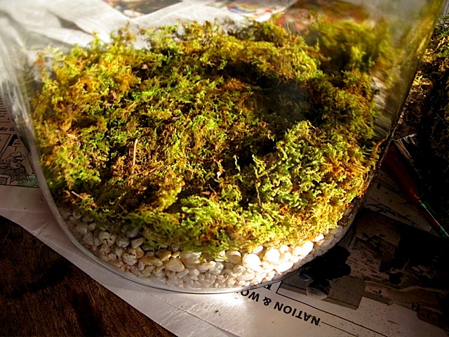 Step Three: Add a layer of sphagnum moss, (sometimes called sheet moss), to hold in the soil and retain moisture. This is optional, but I find it helps the terrarium remain neat. You can also add horticultural charcoal to keep the jar fresh, but it isn’t necessary, (I skipped this for my holiday terrariums)…