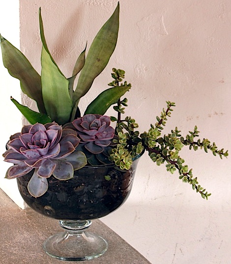 I created a lovely succulent bowl, similar to the one above, to give as a holiday gift this year. I liked it so much that I ended up making this one for myself. I selected a glass pedestal bowl intended for fruit display, ($9 at Target), and lined the bottom and sides with polished black stone, both for practical drainage and decorative drama. The center well was slowly filled with a good potting mix and plants. Designing a terrarium or glass planter is no different from any other garden design project. Color, texture, shape, structural density and form always come into play when designing with plants. I wanted to make this classic shaped bowl a bit modern. Many succulents have bold, geometric shapes, so they seemed like the perfect choice. I love the contrast of these thick-fleshed, colorful plants against the clear, delicate glass. For my vertical element I chose stately snake plant, (Sanseveria trifasiata ‘Laurentii’), and for the mounded, central feature, I chose one large and another small Mexian rose, (Echeveria ‘Pearl’). The trio of plants is softened by the trailing, delicate beauty of variegated elephant bush, (Portulacaria afra variegata). Perhaps stalwarts of terrarium design will brush this combination off as merely a conventional planting. But I think this modern terrarium-hybrid lies somewhere between, and defies hard-line definitions.