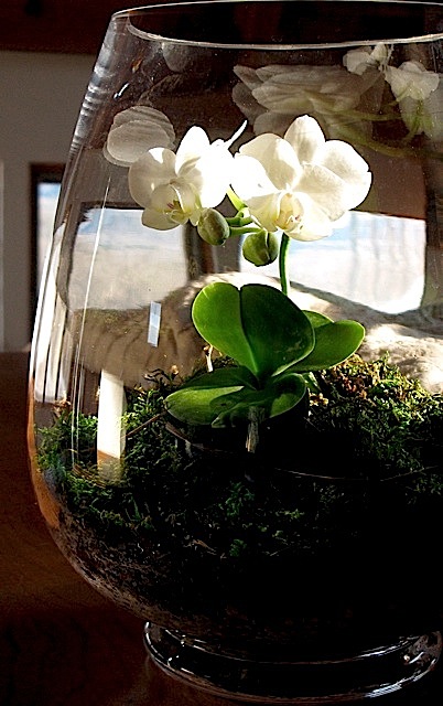 Many plants will thrive within a moist, humid terrarium environment. In fact some, including many of my favorite orchids, actually perform better in my dry, winter home when contained within glass. The tiny moth orchid, (Phalaeonopsis), pictured at the top of this post, ($9 at Home Depot), is happily growing in a mixture of bark and sphagnum moss. Drainage is provided by a mix of pea stone and charcoal at the bottom of the container. Phalaeonopsis thrive in warm, moist conditions. Elevated humidity is provided by a tall, wide glass vase, (found at Target for $12), which holds water and reduces evaporation.