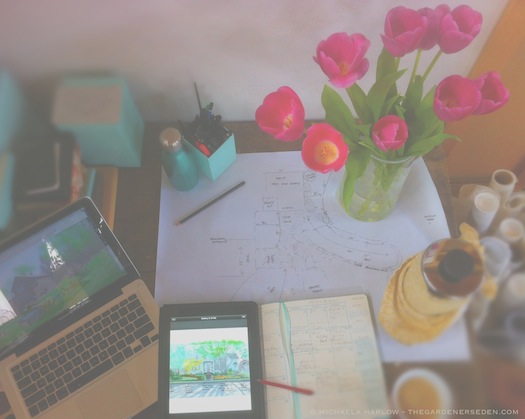 With Planting Plans to Create, Meetings to Make and Seminars to Prepare for, These April Days are Amongst the Busiest in My Calendar Year. On My Desk This Week: French Press Coffee, Master Copy of Scale Planting Plans, Tulips from Dad, Email Notes and Overlay Drawings on the Laptop and an iPad filled with Consultation Sketches Atop an Over-Booked Calendar!Â