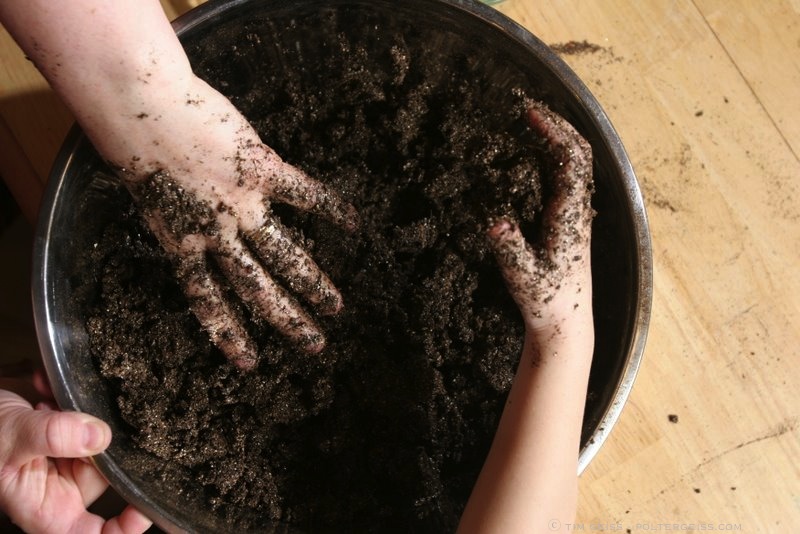 Here, my friends Myriah and her daughter, Dharma, moisten seed their starting mix together