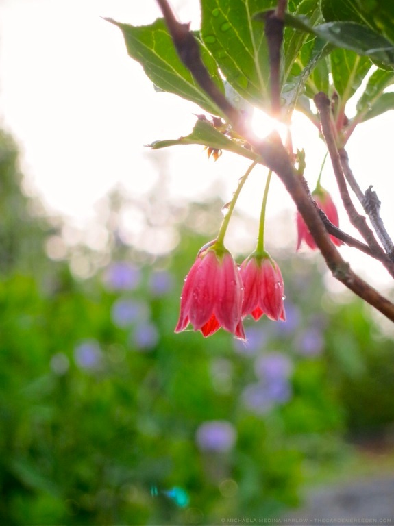 I love the way Red Bells Enkianthus (Enkianthus campanulatus ‘Red Bells’) catch raindrops and blend beautifully with the blue and violet springtime hues in gardens