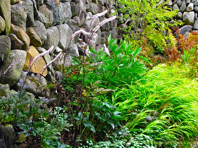 Actaea simlex ‘Hillside Black Beauty’, here in the Secret Garden with Hakonechloa macra ‘All Gold’, Lamium maculatum, Helleborus x hybridus ‘Royal Heritage Strain’, Paeonia mouton x lutea ‘High Noon’, Stewartia pseudocamilla, and a background of bronzing Matteuccia pensylvanica {native Ostrich fern}
