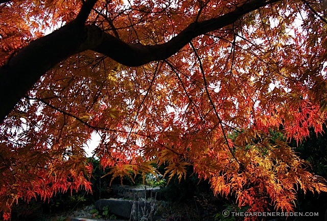 The Blue Green Dragon’ Acer palmatum x dissectum, ‘Seiryu’ at the Secret Garden Door in October. This beauty changes from sea green to orange every fall, like a true chameleon…