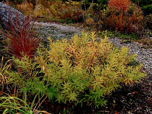 Autumn color Lindera benzoin â“’ Michaela at TGEEntry garden in early October â“’ Michaela at TGE   (Golden color: Lindera benzoin with blooming Sedum ‘Matrona’, Fothergilla major ‘Mt Airy’)