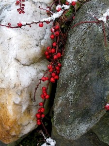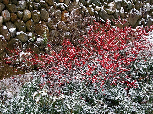 Ilex verticillata and Juniperus chinensis 'Sargentii', Dusted in Snow â“’ Michaela at TGEIlex verticillata ‘Red sprite’ and Juniperus chinensis ‘Sargentii’ dusted in snow at the Secret Garden entrance â“’ Michaela at TGE