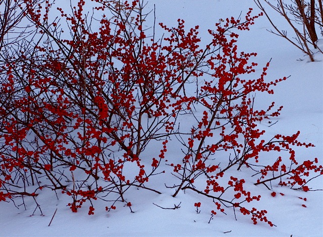 Ilex verticillata ‘Red Sprite’, bright red berries in snow â“’ Michaela at TGE