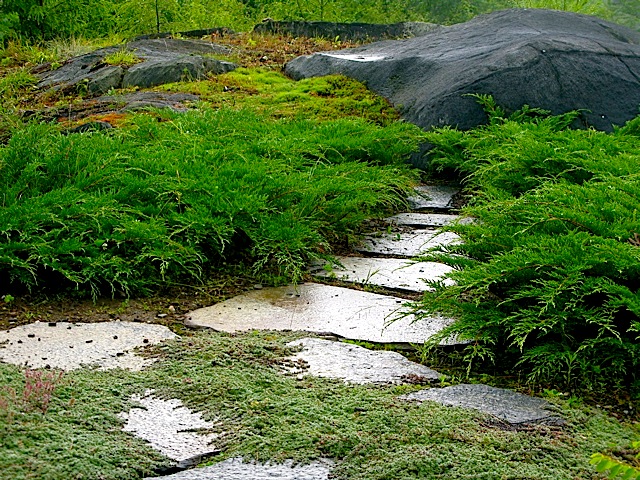 North facing walkway with thyme, microbiota and moss on walkway to ledge â“’ Michaela at TGEPath leading to Northwest look-out with wooly thyme, microbiota and moss â“’ Michaela at TGE