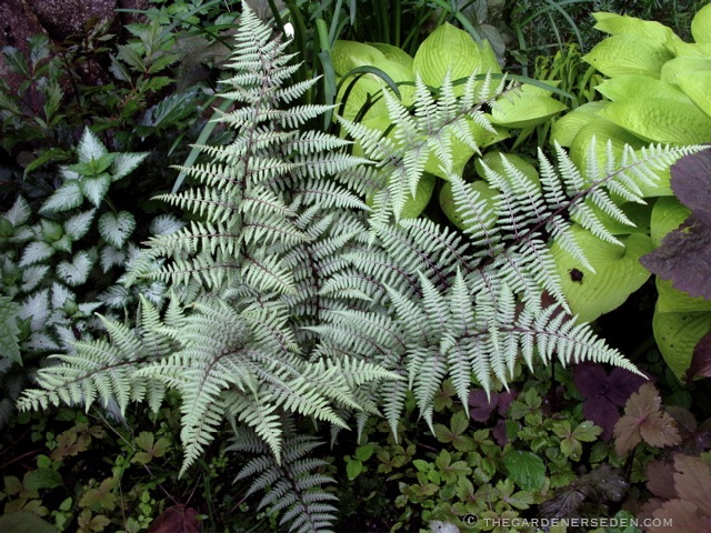 Athyrium nipponicum ‘Ghost’, planted with Hosta ‘August Moon’, Lamium maculatum ‘Orchid Frost’ and Cryptotenia japonica â“’ Michaela at TGE