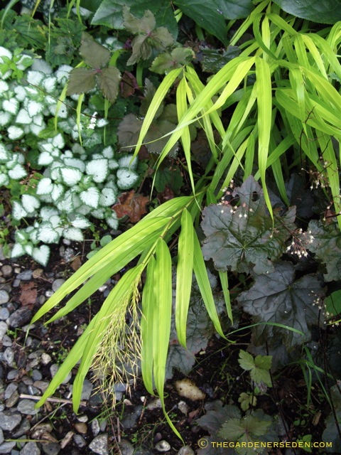 Hakonechloa macra ‘Aureola’ – Japanese forest grass, with Heuchera ‘Palace purple’ and  and Lamium ‘Orchid Frost’ â“’ Michaela at TGE