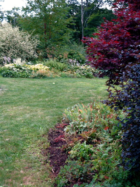 Secret Garden Plantings in late summer.  From left to right: Lamium maculatum ‘White Nancy’, Cimicifuga racemosa ‘Hillside Black Beauty’, Helleborus x hybridus, Hakonechloa macra ‘Aureola’, Paeonia suffruticosa ‘High Noon’