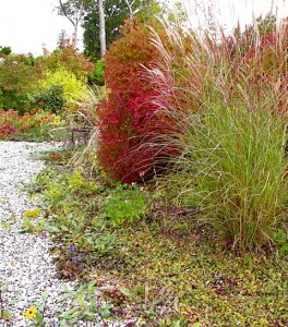 Entry walk with Viburnum trilobum, Miscanthus, Lindera b, Viburnum b, autumn perennials â“’ Michaela at TGEFront walk entry in October â“’ Michaela at TGE (Plantings include: Entry walk with Viburnum trilobum, Miscanthus, Lindera benzoin, Viburnum bodnantense ‘Dawn’, and various autumn perennials in the background )