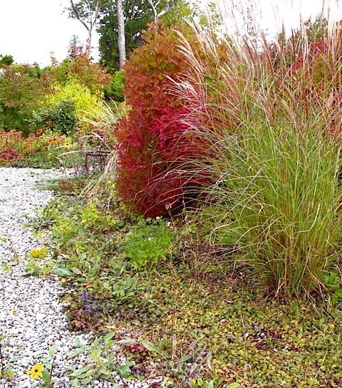 Red twig dogwood and Fothergilla, Miscanthus purpurascens, Sedum â“’ Michaela at TGEEntry Garden/Wildflower walkway, the last week of November â“’ Michaela at TGE  (Miscanthus purpurascens, Cornus alba, Fothergilla ‘Mt Airy’)