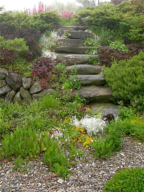 Secret Garden steps - June fog â“’ Michaela at TGESecret Garden Steps on a Foggy June Morning â“’ Michaela at TGE (Plantings include ground cover Cerastium tomentosum, emerging Rudbeckia hirta ‘Becky Mixed’, Sedum ‘John Creech’, and on the stairs: Daphne ‘Carol Mackie’, Heuchera various including ‘Palace purple’, ‘Green spice’, ‘Stormy seas’ and other hybrids; Atop Lupine x hybridus and Juniperus squamata ‘Holgers’)