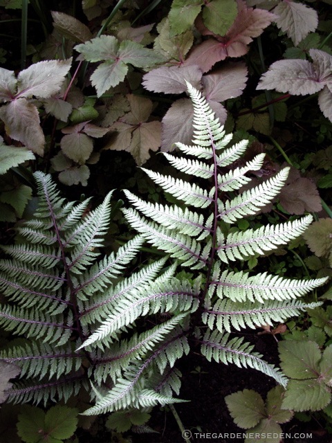 Athyrium filix x femina ‘Lady in Red’ Catches the Afternoon Light at the Secret Garden Threshold in Late May. Here planted with Heuchera ‘Dale’s Strain’, H. ‘Green Spice’ and Phlox divaricata ‘Clouds of Perfume’