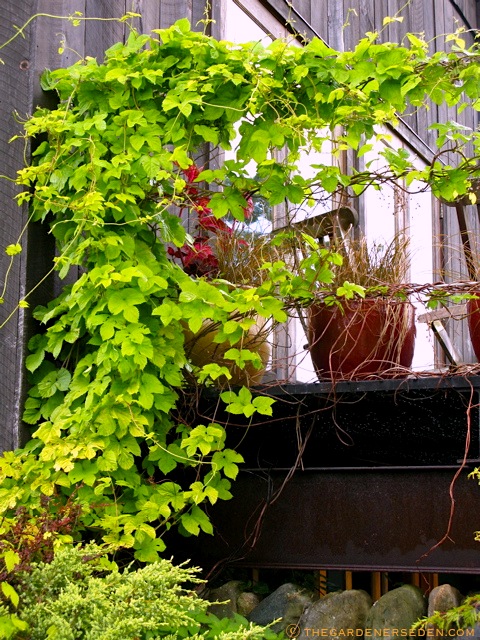 Golden hops vine (Humulus lupulus ‘aureus’) scrambling up the wall and Steel Balcony above the Secret Garden â“’ Michaela at TGE
